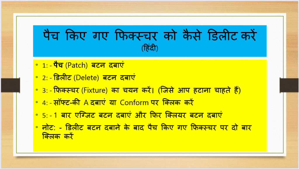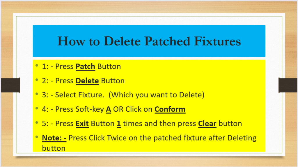 How to Delete Patched Fixtures Here you can learn how to Delete a Fixture (just Follow the theory) Here you can learn in Hindi theory Watch Video Click on Previous for Re-patchingClick on NEXT for Move and Copy Patched Fixtures Previous Home Titan Home Next